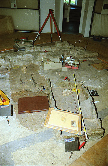 Im Boden Grundmauern eines Gebäudes (hinten), Estrich (ganz links),