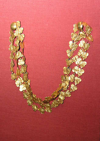 Kette aus 94 in Goldblech getriebenen Efeublättern vom Typ loop-in-loop. Die vier Kettenteile sind durch zwei runde Zierfknöpfe verbunden.