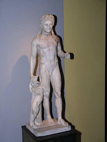 Apollostatue in archaisierendem Stil. Mit der Rechten streichelt der Gott einen Greif, in der Linken vermutlich ehemals eine Lyra