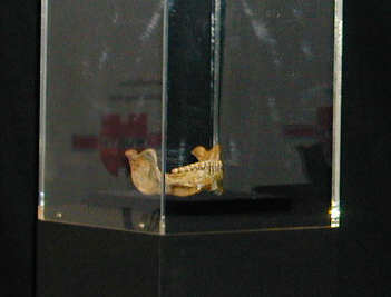 ![]() Der Unterkiefer des Steinzeitmenschen von Mauer. (ca. 500.000 - 600.000 Jahre alt). Abguss, Original im Geologisch-Paläologischen Institut der Univ. Heidelberg Gezeigt in der Ausstellung "Mit 100 Sachen durch die Landesgeschichte" |