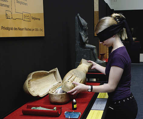 Ausstellungsbesucherin ertastet mit verbundenen Augen ein