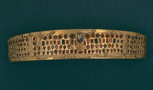 Aus Goldblech und farbigen Steineinlagen gearbeitetes Diadem, 1. Hälfte 5. Jahrhundert. Diademe wurden von vornehmen hunnischen Frauen getragen und auf dem Stirnteil eines Kopftuches aus Leder oder Textil befestigt. © Ungarisches Nationalmuseum, Budapest