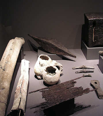 mit Bronzeresten, davor ein Eisenkamm mit exakt gesägten