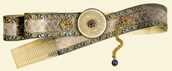 Gürtel mit Edelsteinen Osmanisch-indisch, Mitte 18. Jh. Seraser-Stoff, Gold, Elfenbein, Rubinen, Smaragd, Lapislazuli, Emaille Topkapi Sarayi Müzesi Istanbul, Schatzkammer, 2/258.
