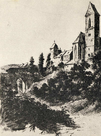 Turm und Chor der ehemaligen oberen Pfarrkirche, das obere Tor und die gedeckte Brücke