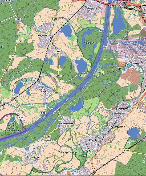 Rheinlauf zwischen Neuburg und Karlsruhe. Karte: Openstreetmap,