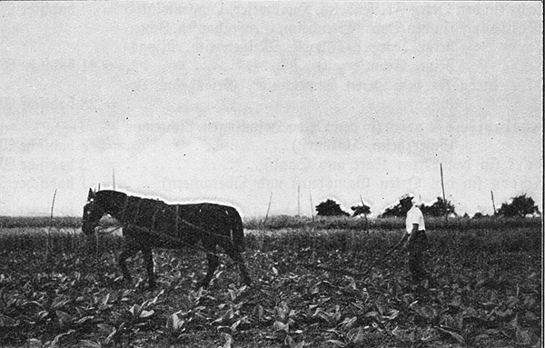 Hacken des Tabaks mit Pferdegespann zwecks Bodenlockerung und