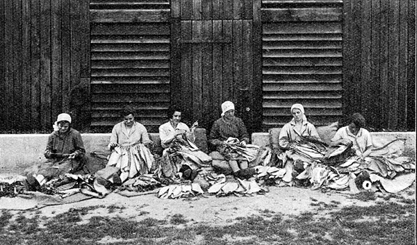 Das Einfädeln des Tabaks nach der Ernte. Frphliche LIeder