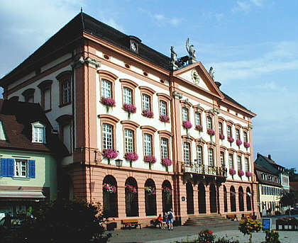 Hauptstraße und Marktplatz werden vom den klassizistischen Rathaus der Freien Reichsstadt (erbaut 1784 von Stadtbaumeister Viktor Kretz) beherrscht. |