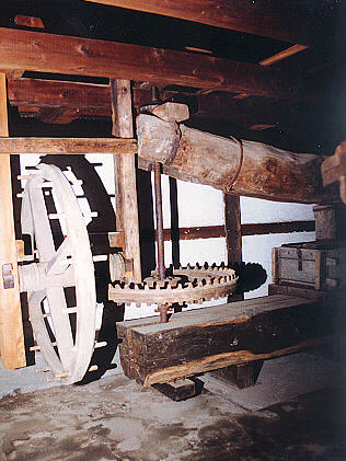 Die Obstpresse hat ein Übersetzungsgetriebe (links), mit