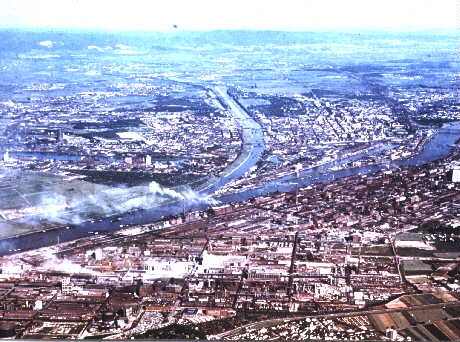 Mannheim und Ludwigshafen, Luftbild Im Vordergrund die Werksanlagen der BASF Ludwigshafen, in der Bildmitte der Rhein mit der Neckarmündung. Rechts davon die Mannheimer Innenstadt und die Handelshafen. |