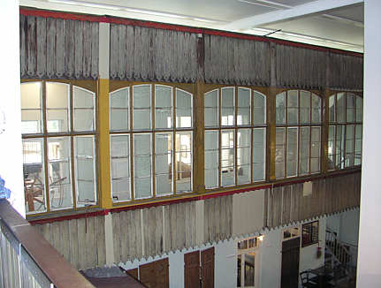 Die Kleinwohnungen im Hinterhaus werden durch einen verglasten Verbindungsgang erschlossen. Dahinter sind modellhaft Wohnsituationen ausgestellt.