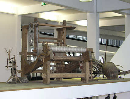 Ausstellungsaufbau: Handwebstuhl im Obergeschoss der Weberei