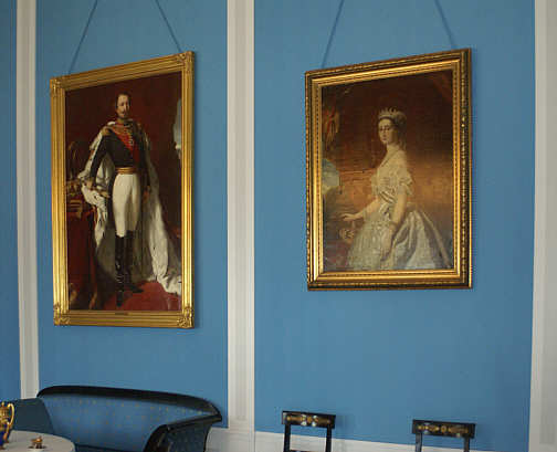 Im Bild links an der Wand das Porträt der Hortense, der Tochter Josephines, der Gemahlin Napoleons I., aus deren erster Ehre mit Alexandre de Beauharnais. Rechts davon das Porträt der Letizia Bonaparte, der Mutter Napoleons I.