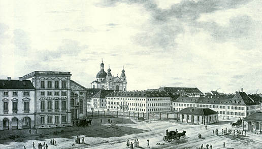 MannheimKurfürstliches ResidenzschlossAnsicht aus dem inneren Schlosshof Links halb verdeckt der Giebel der Schlosskirche, rechts davon im Hintergrund die Jesuitenkirche, davor das Palais Bretzenheim (A2). Den Abschluss des Schlosshofs gegen die Stadt bilden die Schlosswachhäuschen. |
