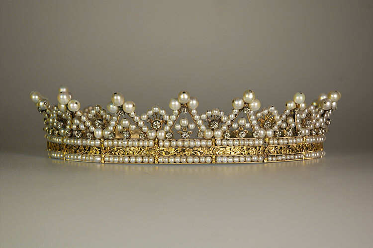 Ein vermutlich vor 1829 in Paris hergestellter, mit Perlen und Diamanten besetzter vergoldeter Reif mit kronenartigen Spitzen.