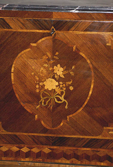 Detail des Kieser-Schreibschranks: Blumengebinde auf der aufklappbaren Frontplatte Wie sich besonders an dem noch grüne Farbreste tragenden Band zeigt, war die Intarsienarbeit ursprünglich farbig gefasst.