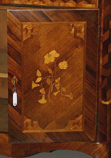 Detail des Kieser-Schreibschranks: Blumengebinde auf der Tür des Unterschranks