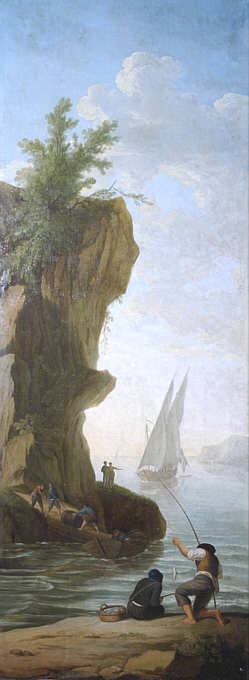 Landschaftsbilder aus dem Besitz des Grafen von Riaucour, des kursächsischen Gesandten am Hofe des Kurfürsten Carl-Theodor. Detail: Küste mit Segelbooten und Anglern