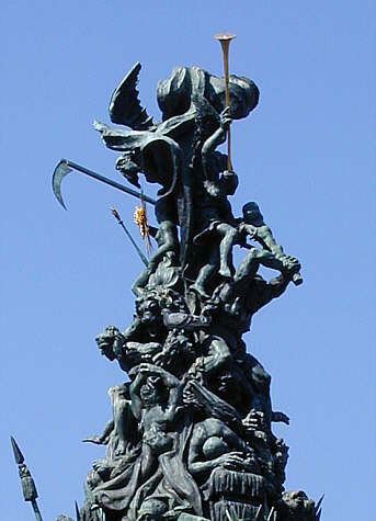 An der Spitze der Pyramide Saturn mit der Sense, der über den Lastern die Veritas (unter ihm) enthüllt. Diese hält ein goldenes Szepter mit einem Auge im Strahlenkranz.
