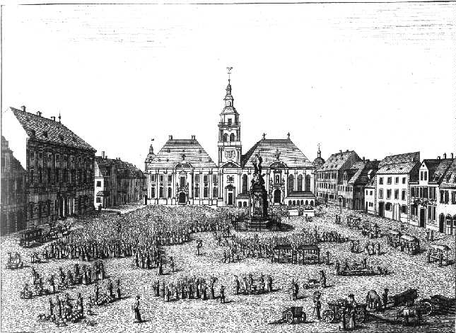 | Der Marktplatz mit Altem Rathaus und der Kirche der Unteren Pfarrei,