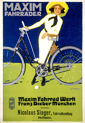 Werbeschild für Maxim-Räder, um 1910. © Technoseum Schläuche flicken und Draisinen reiten