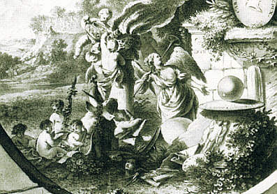 | Ignaz Verhelst: Allegorie auf Carl Theodor als weisen Herrscher und Kunstmäzen (Detail), um 1779 Vor der Säulen sind die neun Musen versammelt, dargstellt durch neun Putten. |