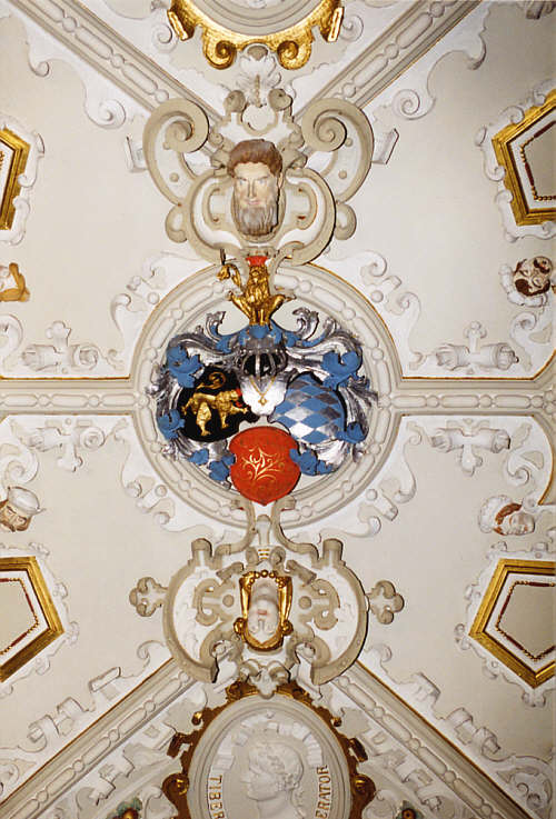 dreifaches pfälzisches wappej mit Löwe, blauweißen Rauten und dem roten Vikariatsschild. Darüber und darunter zwei Masken und (angeschnitten) Bildnisse römischer Kaiser (hier: Tiberius)