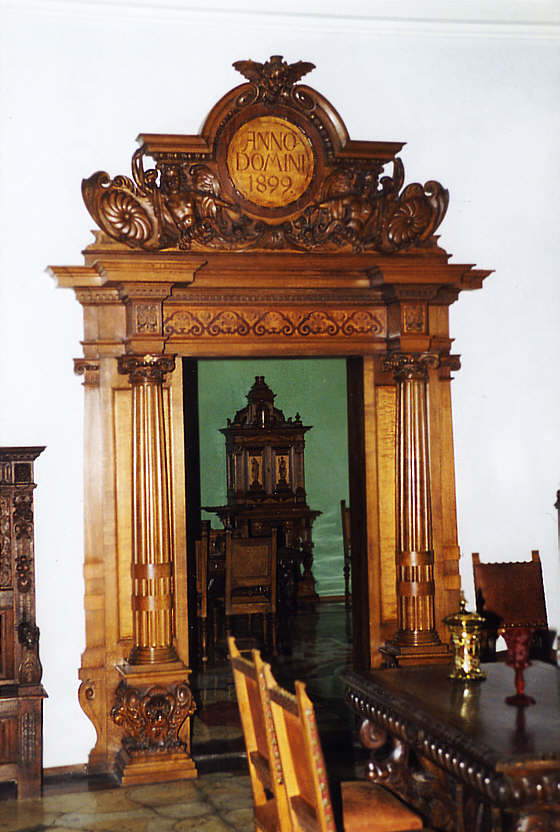 Verbindungstür zum Grünen Zimmer mit Holzschnitzereien und Intarsienarbeiten. Über der Tür die Jahreszahl der Neuschöpfung der Räume, 1899