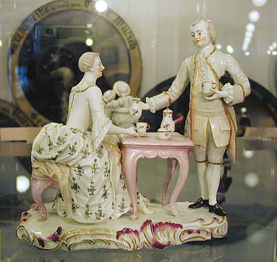 Kaffe- oder Kakaotischchen mit einer sitzenden Frau und einem stehenden und einschenkenden Mann
