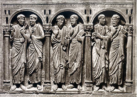 11. Jh., ehemals vermutlich ein Schrankenrelief, greift in der Gestaltung einer Arkadenhall die Gestaltung frühchristlicher Sarkophage auf. Der geschmeidige und betonte Faltenfluss folgt antiken Vorbildern.