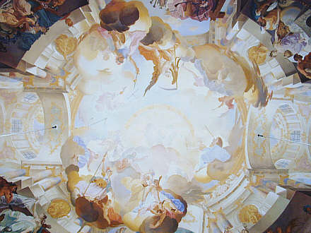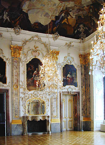 Das Deckenfresko stellt "Gestalten der antiken Mythologie und christliche Tugenden als Schützer der fürstbischöflichen Länder" dar. Das Original von Johannes Zick, 1751, wurde im 2. Weltkrieg zerstört und 1964 - 66 von Wolfram Köberl neu gemalt.
