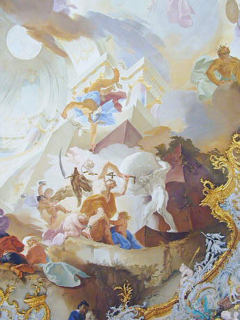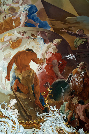 Das Deckenfresko "Harmonie der Elemente und die Bändigung unheilvoller Kräfte als Sinnbilder des beständigen Wohlstands im Hochstift Speyer" von Joh. Zick, 1754 ging im zweiten Weltkrieg zugrunde und wurde 1965 - 66 von Wolfram Köberl neu gemalt.