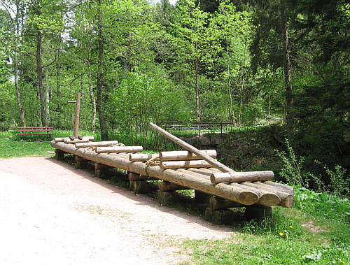 Verkleinerter Nachbau eines vierteiligen Kinzig-Floßes am Wegrand. Demonstriert sind die Steuerung mit dem vordersten Gster, die verschiedenen Bindetechniken mit Wieden sowie die Sperre auf dem hintersten Gster.