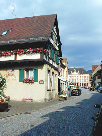 Posthalterei der Thurn und Taxis'schen Post am Stadteingang von Offenburg her, Fachwerkbau des 18. Jahrhunderts, im Hintergrund das klassizistische Rathaus