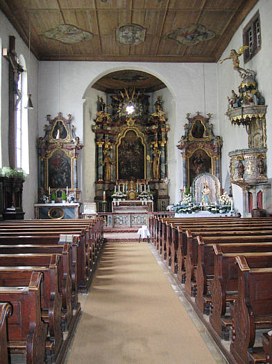 Die Klosterkirche ist ein einschiffiger Saal mit einer polygonal schließenden Apsis, die den barocken Hauptaltar enthält. An der flachen Holzdecke Felder mit Malereien aus der Bauzeit (Ende 17. Jahrhundert).