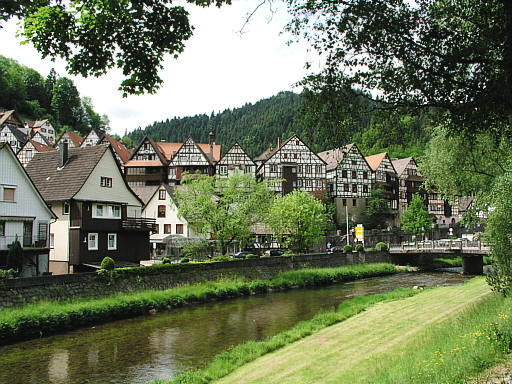 Schiltach vom rechten Ufer der Kinzig aus Häuser an der Kinzig Häuser auf der Stadtmauer Marktplatz Gasthaus zum Adler Straße nach Aufhalten Von der alten Römerstraße aus An der Kinzig
