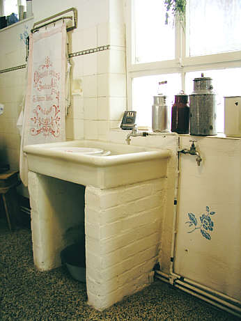 Spülstein aus Porzellan (ehemals Sandstein), auf gemauertem Sockel