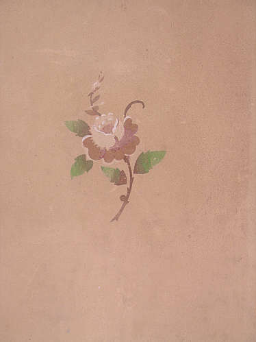 Schlafkammer im Obergeschoss. Wandbemalung mit Rosen auf altrosa Untergrund.