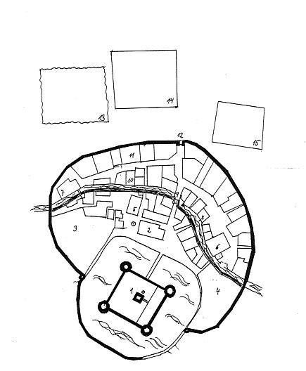 Erste Stadterweiterung, um 1300Rekonstruktion der Hausplätze zur Zeit der ersten Erweiterung (auf der Grundlage der Deißingerschen Vermessung 1792 und der Umzeichnung Karl Lists 1954) Bühler, 700 Pfund S. 106