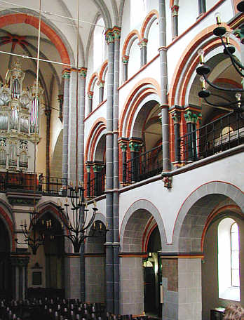 südliche Mittelschiffwand Vierzoniger Aufriss mit Seitenschiffarkaden, Emporengeschoss, blindem Triforium und Lichtgaden, nach dem Vorbild der französischen Frühgotik. Im Hintergrund die frühgotische Formen zeigende Orgelempore. |