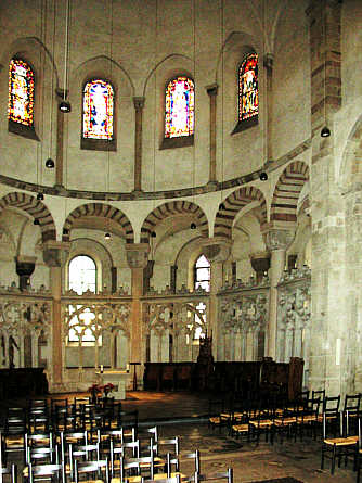 Salierzeitlicher Umgangschor aus der Mitte des 11. Jahrhunderts, Obergaden der Chorkonchen Mitte des 12. Jh. erneuert Restaurierung nach Kreigszerstörung nch 1956.