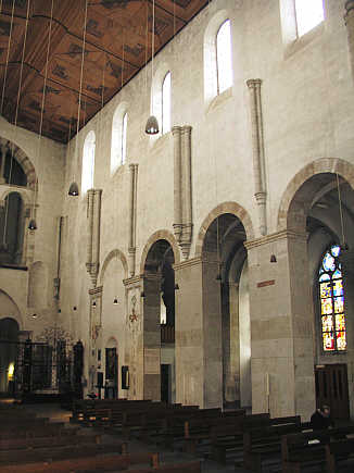 Mittelschiffarkaden auf rechteckigen basislosen Pfeilern. Am Obergaden die zisterziensischen Gewölbedienste des 13. Jh. Die Holzdecke nach der zerstörung des 2. Weltkriegs von W. Weyres.