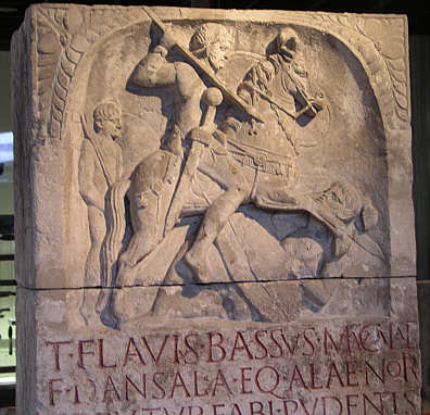 Grabdenkmal für den Reiter Titus Flavius Bassus Darstellung als Reiter mit Schwert, Lanze und Schild, wie er einen Gegner niederreitet. Hinter ihm ein Fußsoldat oder ein Diener.