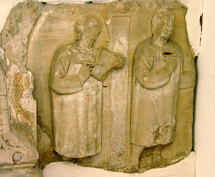 Schreib-Szene Zwei Männer, von denen der linke gerade mit einem Bronzegriffel eine Notiz auf einem Wachstäfelchen festhält.