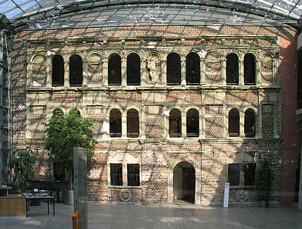 Dreigeschossige Gliederung mit giebelbekrönten Fenstern im Erdgeschoss und rundbogig schließenden Zwillingsfenstern im 1. und 2. Obergeschoss. Im 2. Obergeschoss Figurennischen zwischen den Fenstern.