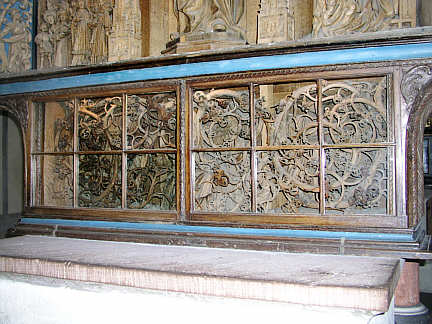 Meisterwerk der spätgotischen Schnitzkunst, gearbeitet von Henrik Douvermann, 1535/36. Predella mit dem schlafenden Jesse, aus dem die Wurzel des Stammbaums Christi entspringt.