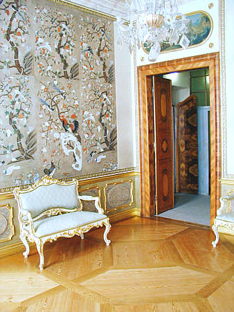 Appartement des Erbprinzen Wandbespannung mit Papiertapete im chinesischen Stil. Vermutlich privates Schlafzimmer des Erbprinzen