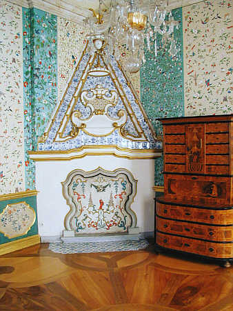 Appartement des Erbprinzen Kamin mit chinesisch verzierter Abdeckung und Aufbau aus blau-weißen Fayence-Kacheln