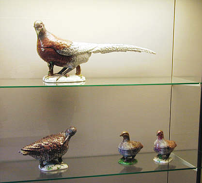 Terrinen in Form eines Fasans, einer Schnepfe und zweiter Tauben aus Fayence